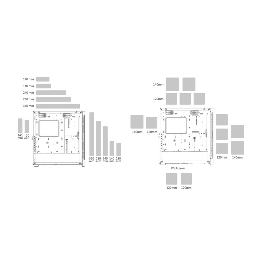 Duoface Pro RGB は、幅 240 mm のボディ設計により、E-ATX マザーボード、390 mm グラフィックス カード、2 台の 3.5 インチ HDD と 2 台の 2.5 インチ SSD を簡単に収容できる十分な内部スペースを提供しており、さまざまなユーザーや利用目的に適合し、要求の厳しいシステム構築も可能です。